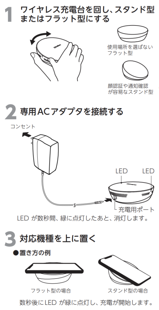 安価なワイヤレス充電器だとこのACアダプターが付いていないので注意が必要です。