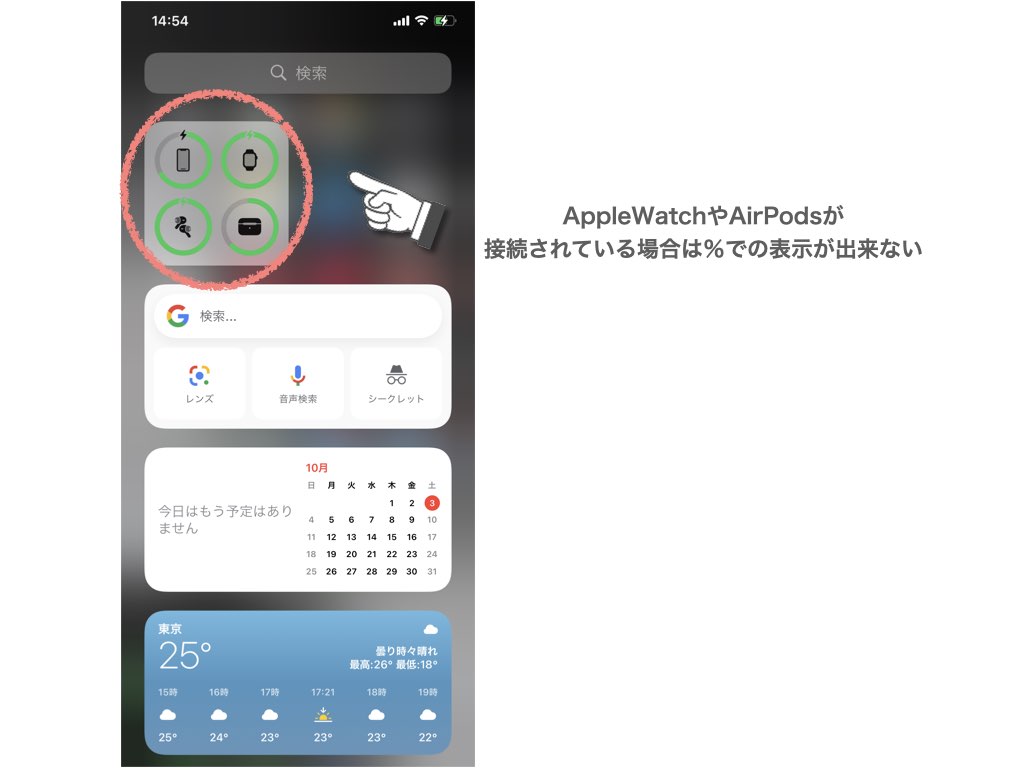 というのが「AppleWatch」や「AirPods」をBluetoothでiPhoneとペアリングしている場合は小さいサイズのウィジェットでは残量の%表示が出来ないので注意が必要です。