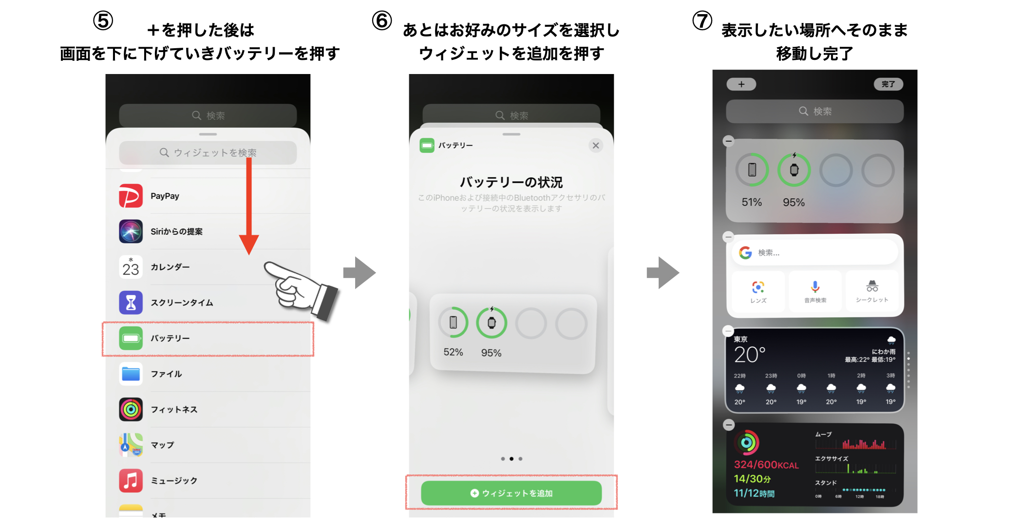 まずは「iPhoneのホーム画面を表示」→「画面を右にスライド」→「表示されているウィジェットを長押し」→「ブルブル震えてる状態で右上の+ボタンを押す」→「下まで画面をスライド」→「バッテリーを押す」→「サイズを選択しウィジェットを追加を押す」→完了!