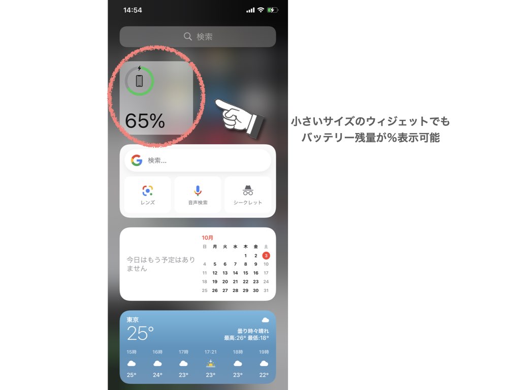 小さいサイズのウィジェットでバッテリー残量を表示する場合、iOS14.01で%表示が可能になりましたがiPhone単体で利用している場合のみです。