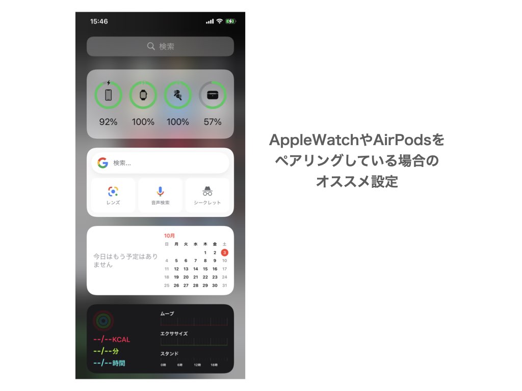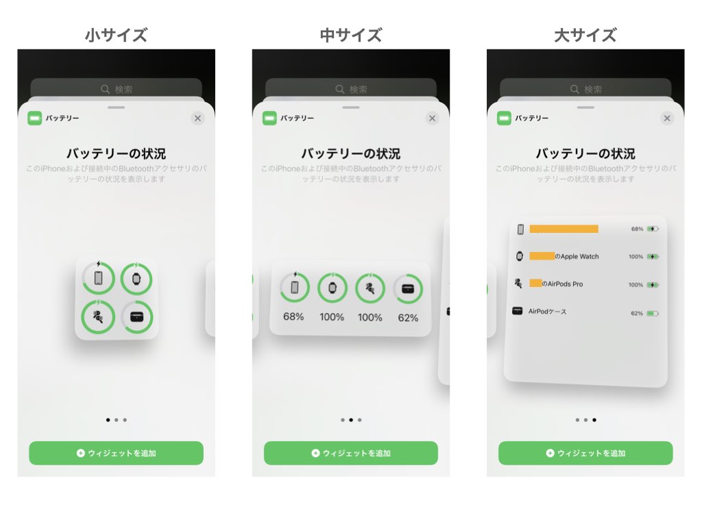 個人的は中サイズがやはり丁度いいと思います。iOS14のウィジェットは『AppleWatch』『AirPods』も見やすく表示ができるのでホーム画面から右に画面をスライドするだけで簡単に確認が可能です。