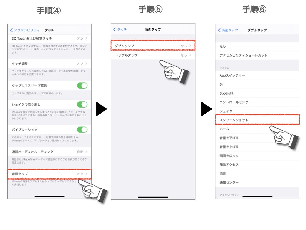 手順はこちら→①iPhoneの設定をタップ→②アクセシビリティをタップ→③タッチをタップ→④背面タップ→⑤ダブルタップをタップ→⑥スクリーンショットを選択→完了