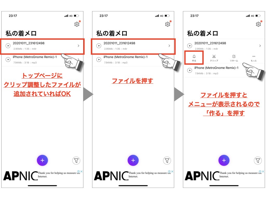 手順④で着メロメーカーのアプリにファイルを保存したので、次はお好みで曲の長さ・どの部分を再生するかの調整を行います。下記の手順に沿って操作をして下さい。