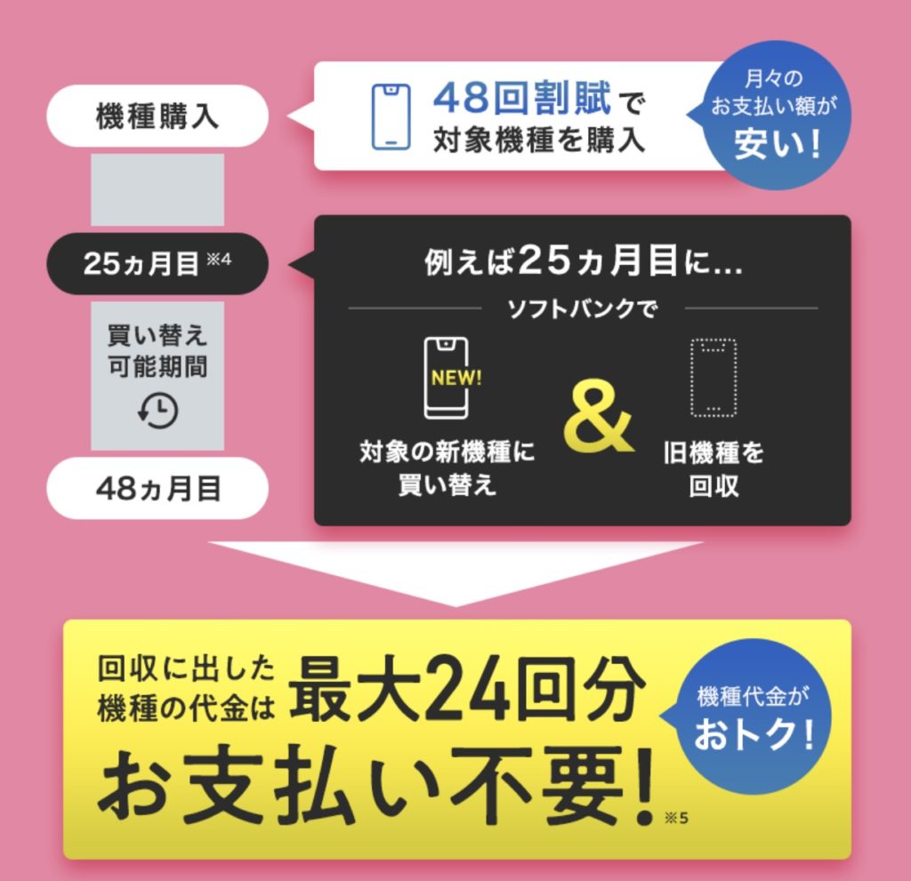 これを24回支払うと48,000円。残り48,000円の残金が残っている状態ですね。しかし25ヶ月目にまた新しいiPhoneに機種変更し、以前の機種を返却すれば、残りの48,000円の残債が免除出来る契約です。いわば半額購入出来ると言う事。